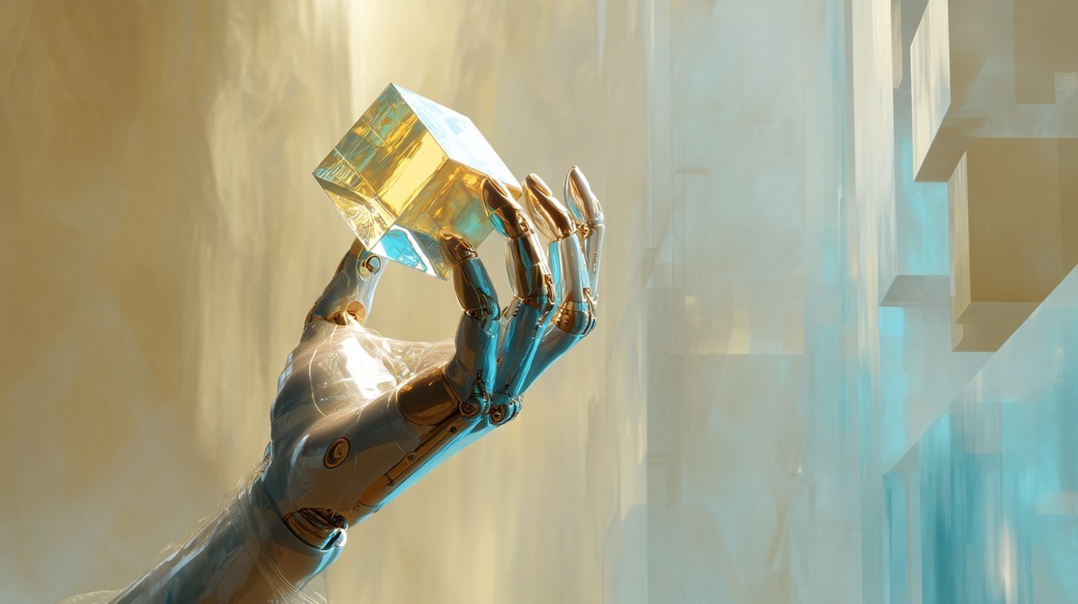 Создано на основе запроса: A surreal digital painting of a cybernetic hand holding a glowing translucent cube, a soft golden and blue color