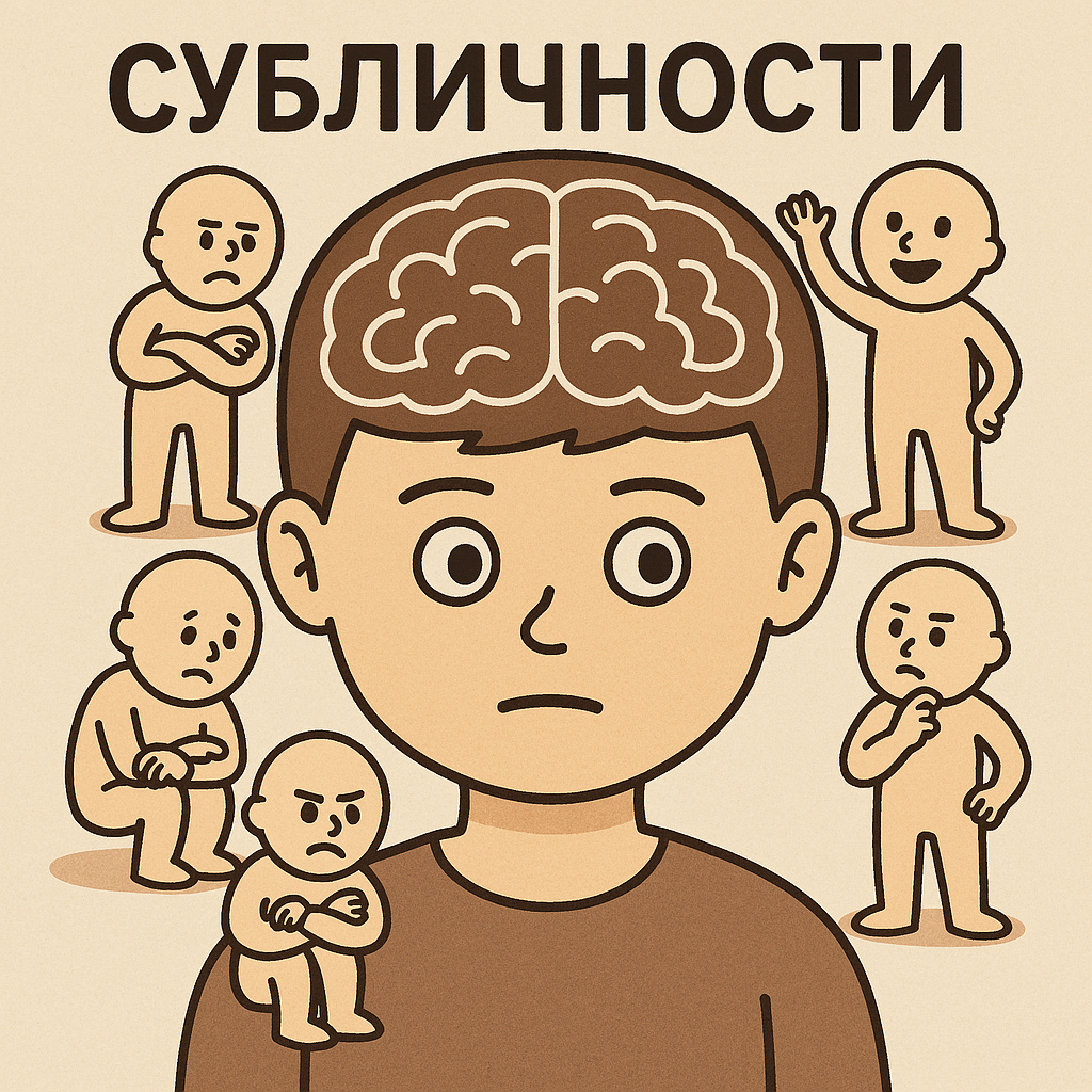 Субличность. Субкультура. Сублимация. Утопические мечты о целостности, собранности, внутреннем единстве у многих людей пока терпят крах. Антиутопии набирают обороты. Утопии терпят крах и на уровне целой планеты. На уровне материков. Стран и государств. На уровне городов и посёлков. Сообществ — профессиональных, общественных, творческих. На уровне семей. И — на самом глубоком уровне: на уровне личной психики. С него и начнём. Что такое субличность? Субличность — это не болезнь и не выдумка. Это — часть нашей внутренней психической жизни. Как говорил Роберто Ассаджиоли: «Субличность — это определённая совокупность установок, поведенческих стереотипов, верований, влечений и т.д., которая обретает целостную различимую форму лишь в нашем сознании». Проще говоря — внутри каждого из нас живёт множество Я. Эти Я помогают нам: – удовлетворять желания, – справляться со стрессом, – защищать главное Я, – адаптироваться к разным ситуациям. Но бывает и наоборот — они мешают. Спорят. Ранят. Перетягив