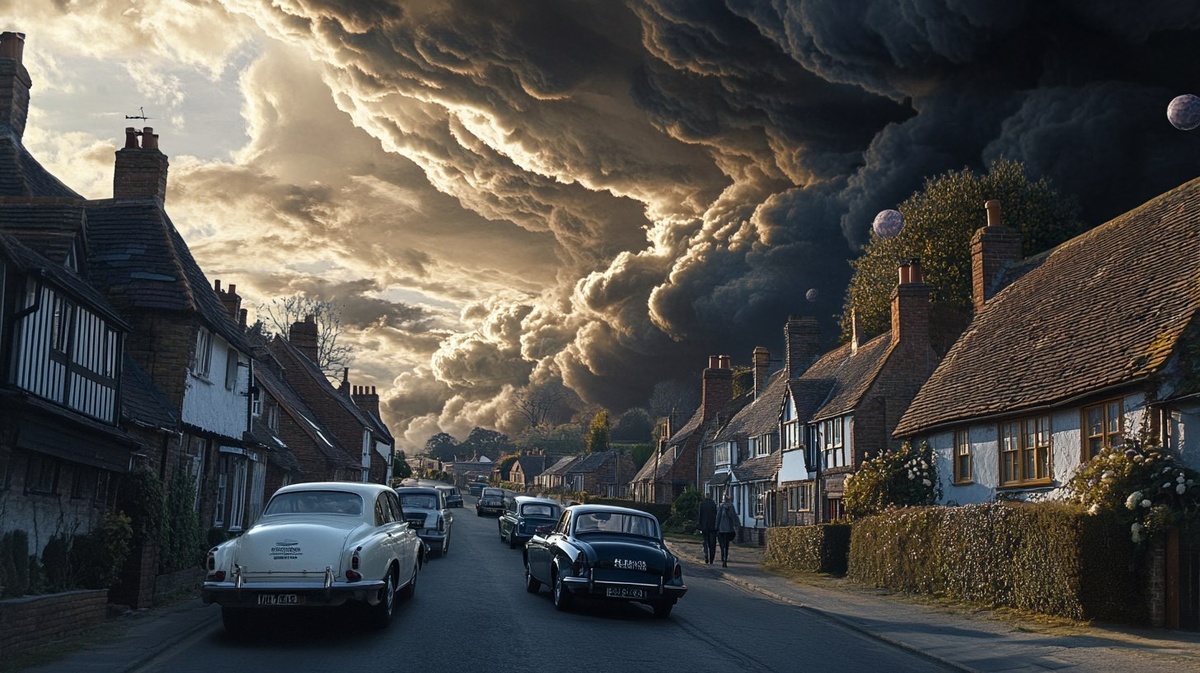 Создано на основе запроса: loads of white, old aged pensioners fleeing a beautiful English village as the sky on one side gets dark and