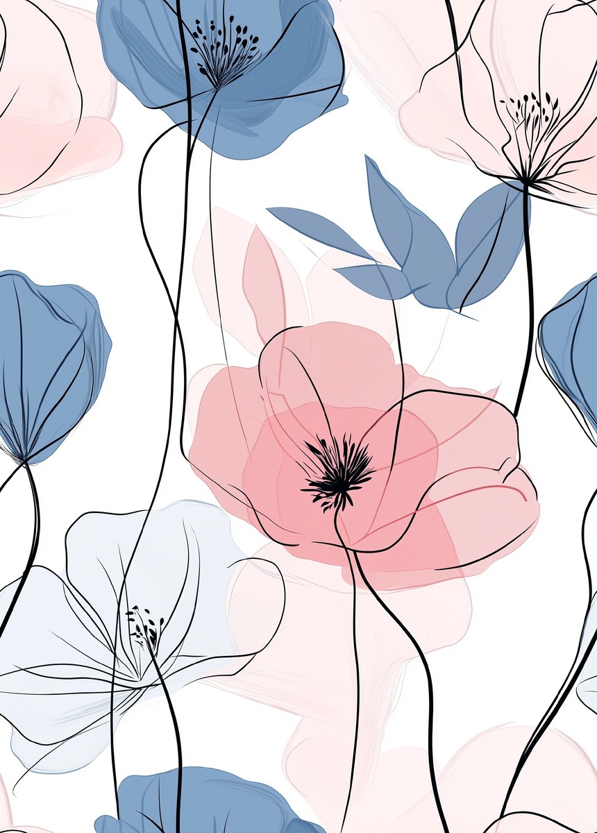 Создано на основе запроса: Blue and pink flowers, simple line art with solid lines and flat color with no shading, large shapes