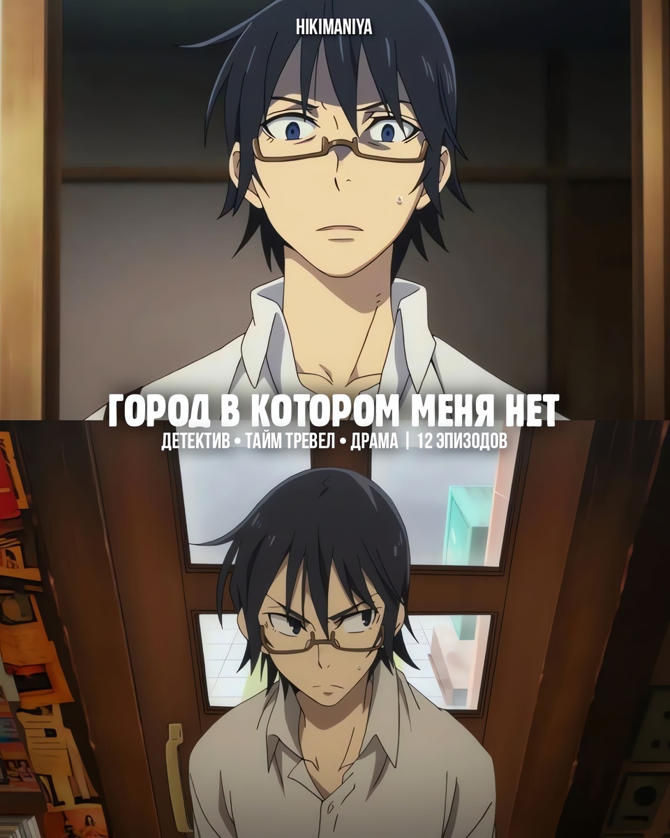 «Город в котором меня нет» Сюжет: 29-летний мангака Сатору Фудзинума обладает способностью «перемотки», возвращающей его в прошлое, чтобы исправить какую-либо трагедию. Когда рядом с ним случается происшествие, его сознание непроизвольно возвращается назад на несколько минут, что позволяет ему оглядеться и исправить ситуацию. Однажды убивают его мать, и Сатору понимает, что это как-то связано со случаями похищения и убийства детей, происходившими вокруг него в детстве. Его способность отправляет его назад на 18 лет. Сохранив все воспоминания взрослого, Сатору оказывается в теле себя десятилетнего и решает найти убийцу детей, чтобы предотвратить и убийство матери в том числе. Ключом к исправлению цепи событий он считает похищение и убийство его одноклассницы Каё Хинадзуки. Название «Город, в котором меня нет» присутствует внутри самого аниме: так называется рассказ Каё, в котором она пишет о том, что хочет уехать ото всех на какой-нибудь остров. Тем самым, название говорит об отрешё
