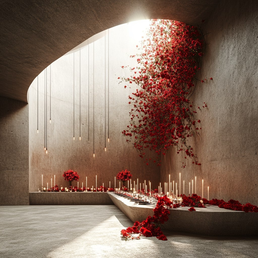 Создано на основе запроса: a realistic image from a low angle of a wedding hall bold minimalistic hall with shotcrete and red flowers and