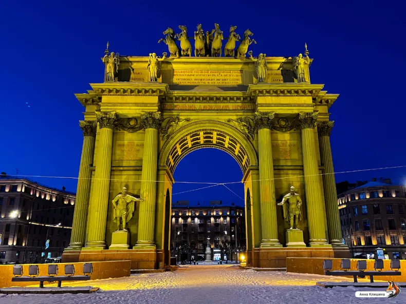 Нарвские ворота — не просто украшение площади. Это голос истории. Венчает арку рвущаяся вперёд колесница Славы, запряжённая шестью лошадьми. Будто и правда торопится донести добрую весть — русские войска вернулись с победой из Парижа. Сначала ворота были деревянными. Архитектор Кваренги построил их в 1814 году, почти сразу после победы. А потом, чтобы увековечить эту славу, в 1830-х на том же месте возвели каменные — по проекту Стасова. И вот теперь на площади Стачек стоит настоящая арка-памятник. Грозная и торжественная. Между массивными колоннами — фигуры русских воинов. Также Нарвские ворота украшены статуями гениев Славы и гениев Победы.
