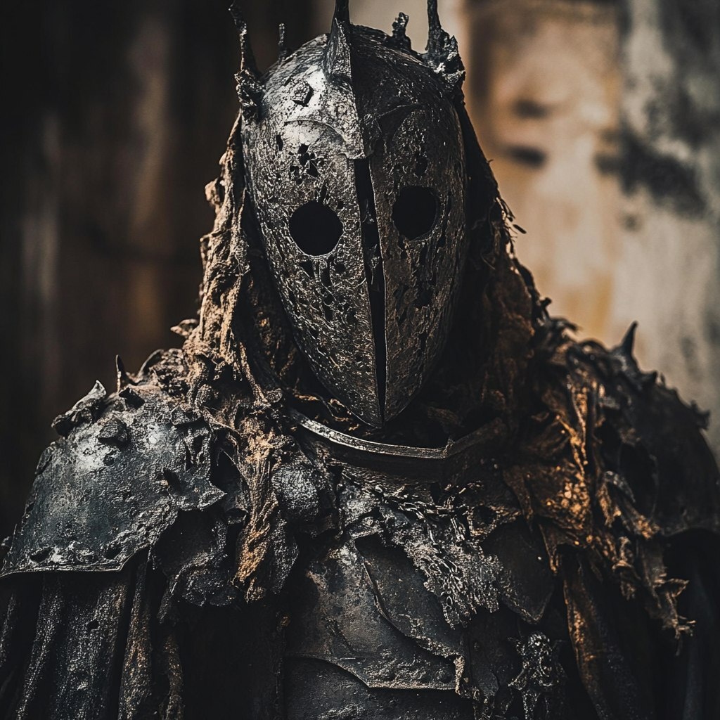 Создано на основе запроса: A terrifying ghostly medieval knight in full armor with nightmarish traits and unsettling appearance