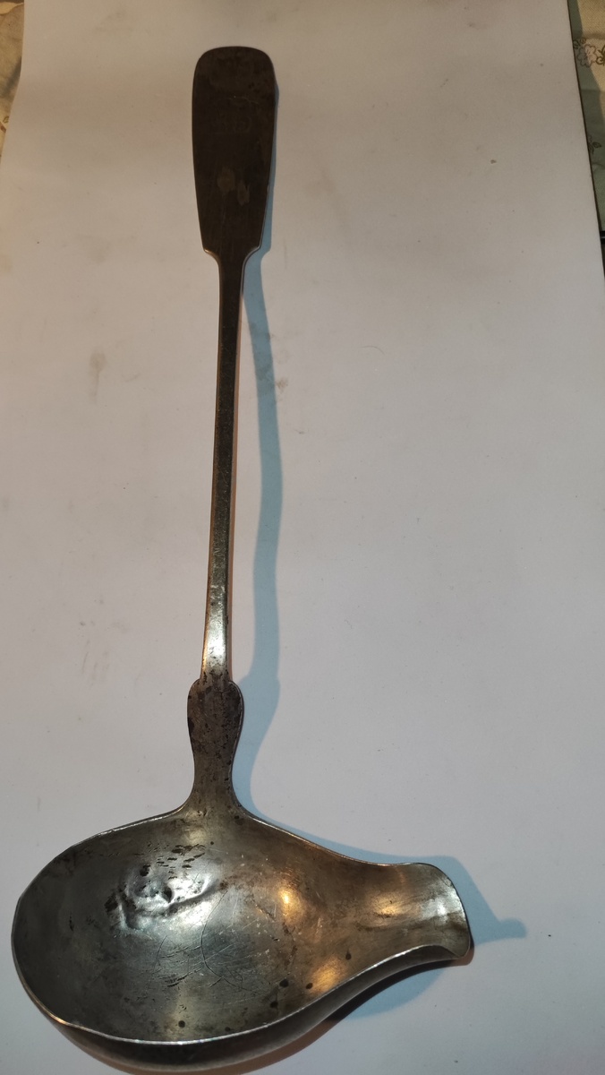 ... кто такую не хочет купить за дешево? Все хотят. Да и за дорого - все хотят. И это называется "синдром единственного предмета". Купил человек что-то... И думает, что у него в руках уникальность. И радуется. И носится с ним как с "писаной торбой". Моё мнение: и пусть себе радуется. Никому же не мешает? :0))) Вот, допустим, у меня есть этакая штука: купил не дорого (по моим представлениям) - по нижней планке лома серебра. Германия. 12 . (лотовая проба = 75% серебра) Вопрос лишь в дате изготовления. И я так надеюсь: конец 17- начало 18 вв. Вот фото: Для чего? Не знаю... Я с этой штукой пеку блины... :0))) ПС Фирма АДЛЕР, Кёнигсберг, с 1847 года