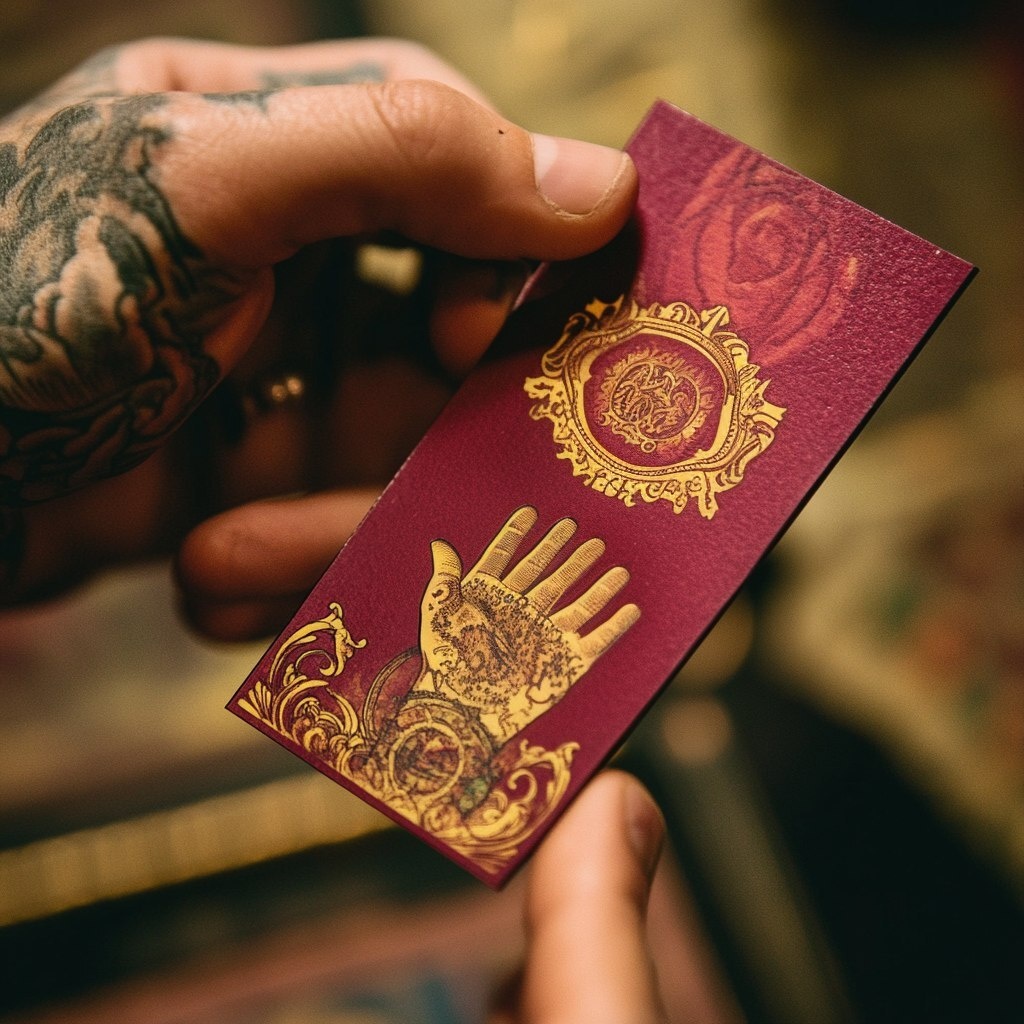 Создано на основе запроса: Idol Hands on a maroon business card for a tattoo shop --- Автоперевод: Идол в руки на бордовой визитной карточке для татуировки Как тебе такое изображение? 🤔 https://dzen.ru/id/65c0c65c86e4f837c27b24d7 #ИИ #AI #нейросеть #midjourney #art