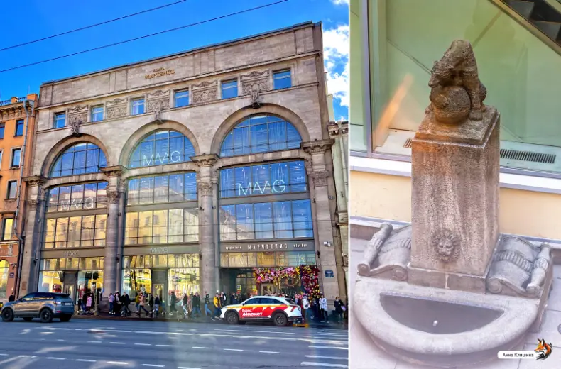 Мало кто догадывается, что среди суеты Невского проспекта есть один очень тихий дворик. Если не знать, куда свернуть, можно пройти мимо и не увидеть живущего там белого медведя. Только из известняка. Фонтан с белым медведем находится во дворе Торгового дома Ф.Л. Мертенса. После 2007 года здание занял магазин одежды Zara, а когда зарубежные компании ушли из России, здесь разместилась компания Maag (переименованный Zara).