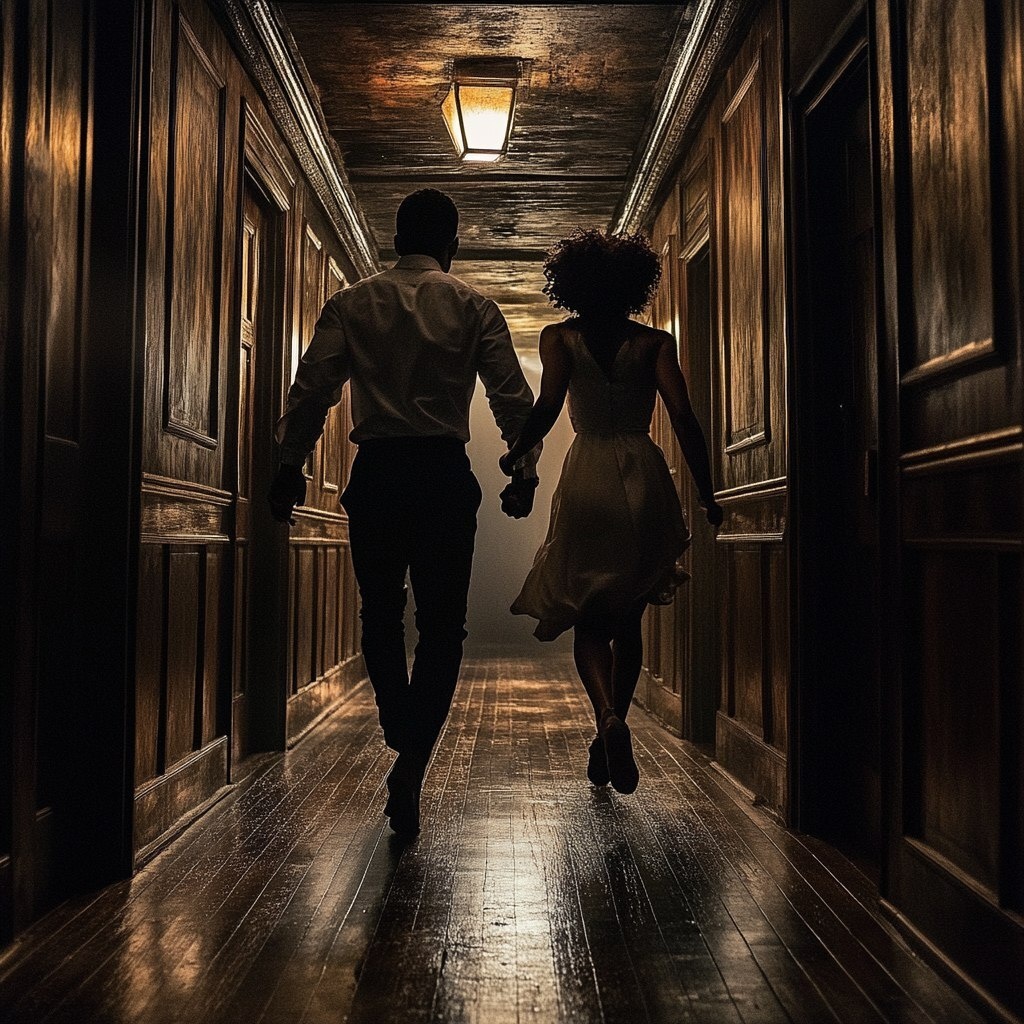 Создано на основе запроса: black couple in silhouhette running away from camera in a dilapitaded wood paneled hallway with dim lighting
