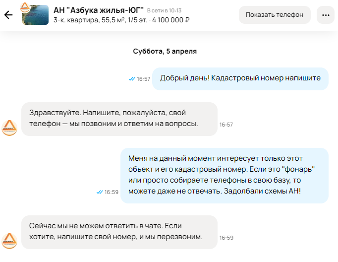 Сейчас помогаю своему клиенту найти подходящую для него недвижимость. Ищу и я, и он сам. Нашел он один вариант, скидывает мне, чтобы я собрала нужную информацию. Я, соответственно, начинаю связываться с АН (агентство недвижимости), чтобы узнать кадастровый номер объекта. Почему начинаю с этого? Потому что там есть основная информация об объекте: адрес, площадь, назначение (жилое, нежилое), этаж, вид жилого помещения (квартира или просто жилое помещение - да, есть разница), кадастровая стоимость (это для понимания размера будущего налога). Уже на этом этапе могут найтись несостыковки объявления и реального помещения. Бывает, что уже на этом этапе мы прекращаем рассматривать объект для покупки. А теперь смотрите, что обычно происходит, когда я прошу АН предоставить кадастровый номер объекта. Обратили внимание на мою фразу "Задолбали схемы АН!"? Объясняю. Часто данного объекта в продаже нет. АН выставляют "фонари" - несуществующие объекты с привлекательной ценой. Потенциальные покупатели