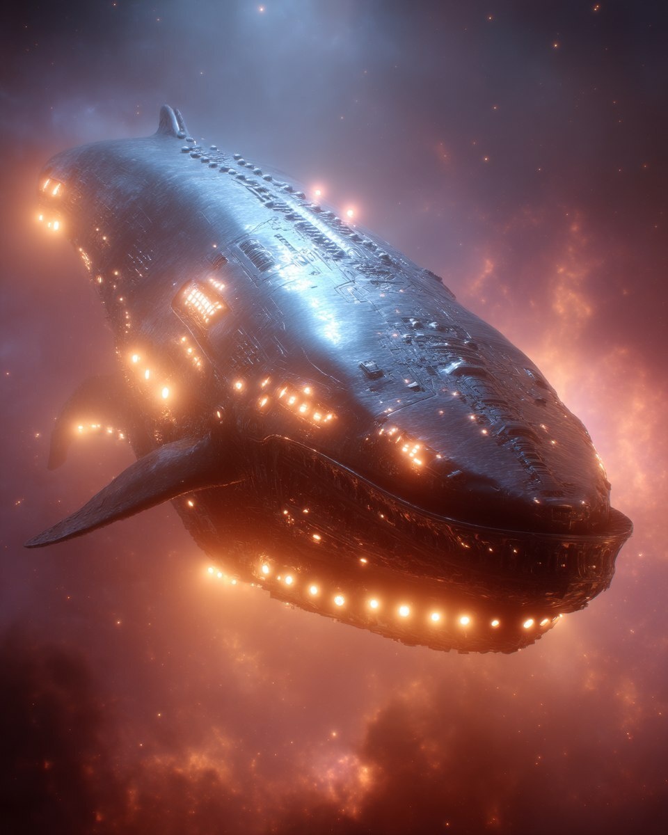 Создано на основе запроса: Matrix Inspired, Nave espacial colossal biomecânica, semelhante a uma baleia cósmica com pele iridescente e luzes bioluminescentes pulsando ritmicamente, navegando silenciosamente através de uma nebulosa de poeira estelar roxa e dourada, arte conceitual épica, iluminação etérea. spaceships.