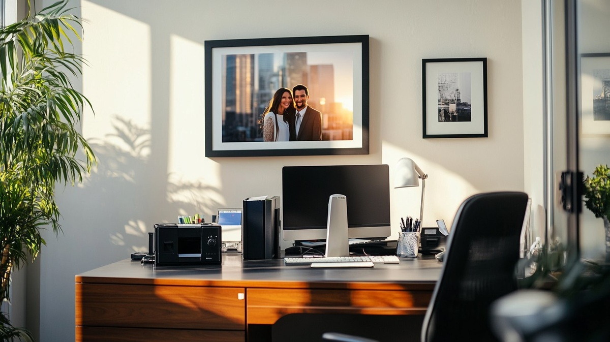 Создано на основе запроса: work desk in office building with framed photo of straight couple