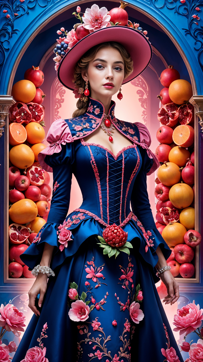 Цветочно-фруктовые фантазии нейросети Плейграунд: красотка в стиле рококо