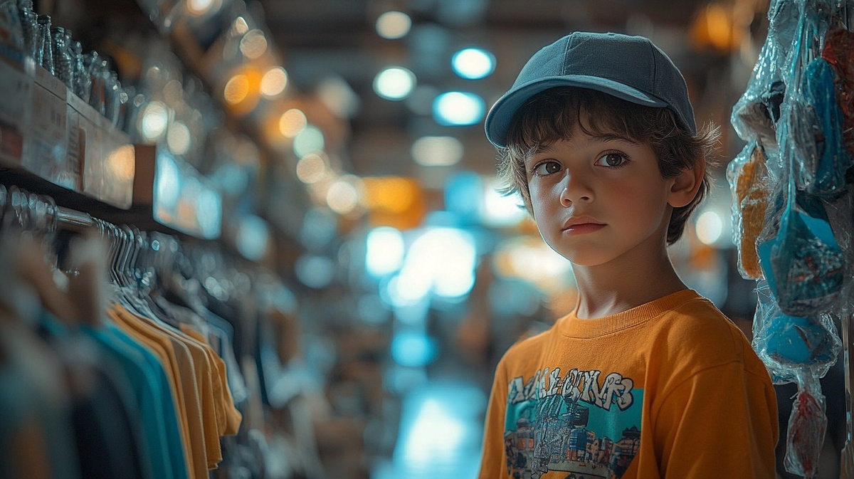 Создано на основе запроса: an hiperrealistic picture of a mexican kid trying a new shirt in a department store. he's looking himself in the mirror.