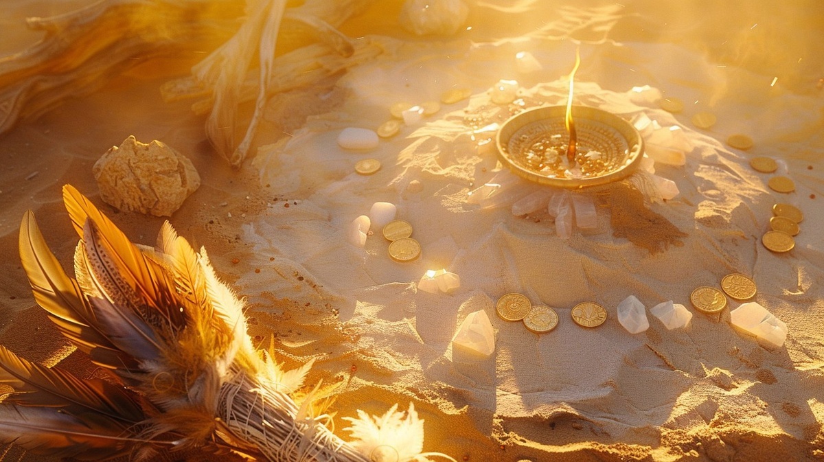 Создано на основе запроса: photo-realistic desert scene, circular setup of feathers, crystals, burning sage, gold coins, silk fabrics on