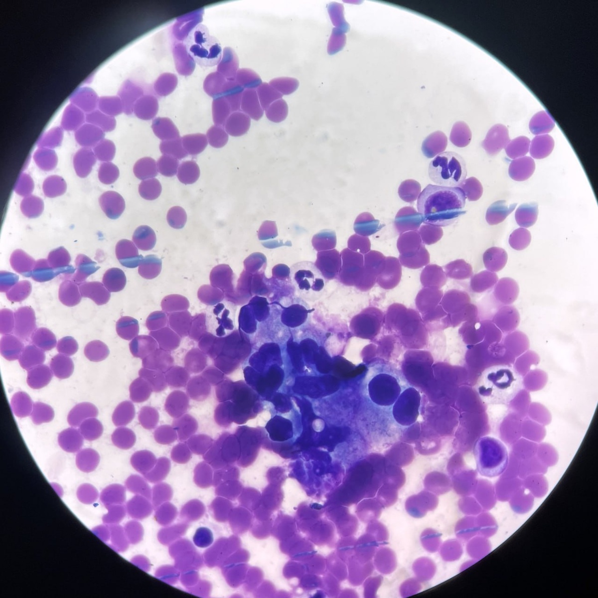 Метастаз рака поджелудочной железы в лимфоузел. Пациентка 1964 г.р. Объектив 100x. #цитология