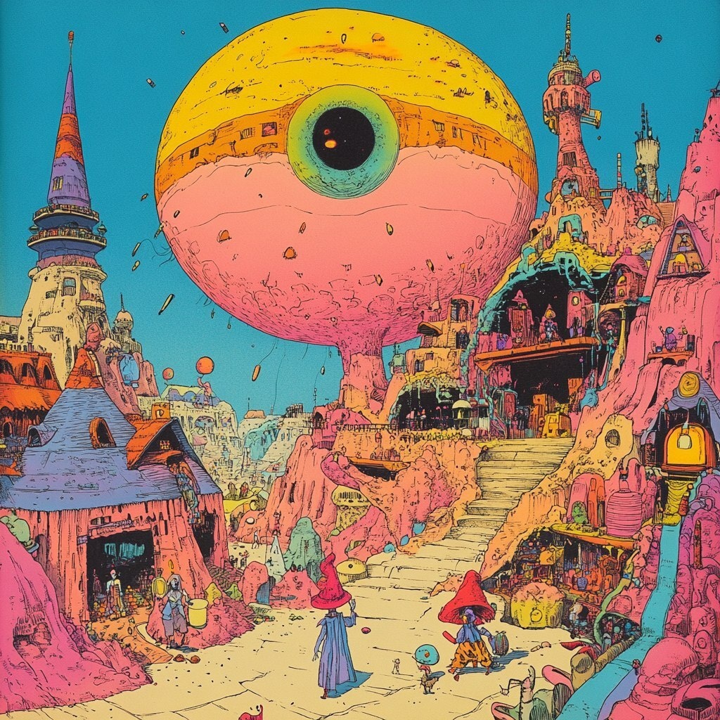 Создано на основе запроса: A colorful, psychedelic cartoon scene of an alien planet with friendly creatures in various costumes and hats celebrating around the base where human-looking aliens live, in the style of Moebius. In the center is one large eyeball that takes up most of the frame. The background shows houses made from different materials like wood, metal, plastic, and fabric. There are also some colorful patterns on cloth hanging from the buildings. --- Автоперевод: Красочная, психоделическая мультипликационная сцена с инопланетной планетой с дружелюбными существами в различных костюмах и шляпах, празднующих на основе, где живут человеческие инопланетяне, в стиле Мобиуса. Как тебе такой вариант? 🤔 https://dzen.ru/id/65c0c65c86e4f837c27b24d7 #ИИ #AI #нейросеть #midjourney #art