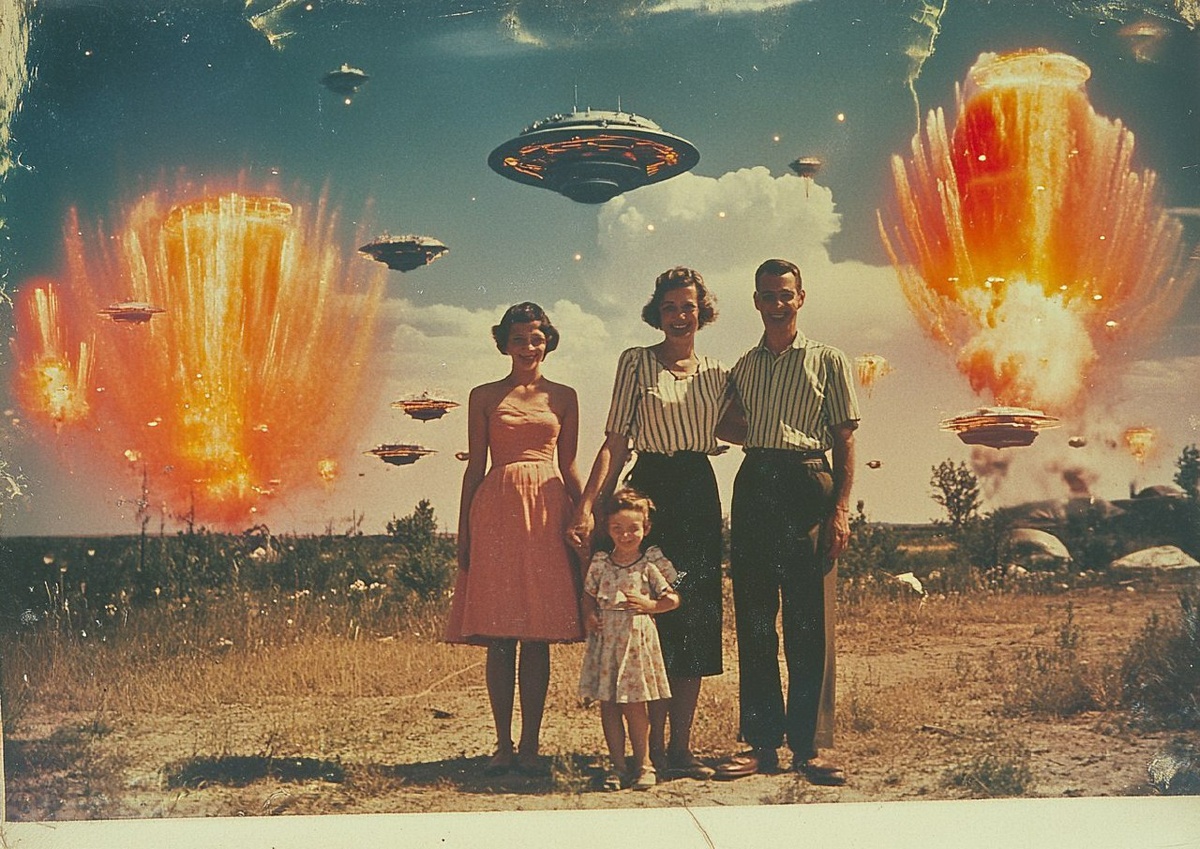 Создано на основе запроса: happy family vacation photo with spaceships exploding in the distant background, 1970s polaroid, high saturation