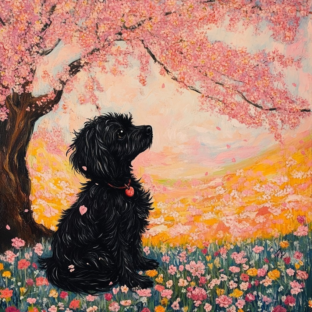 Создано на основе запроса: small black dog, field of flowers, cherry blossom tree, vibrant, dreamy