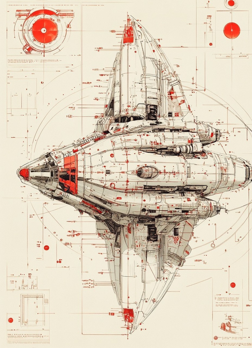 Создано на основе запроса: technical drawing, spaceships, hyperdetailed, clean lines, clear notation in red, full color, traditional