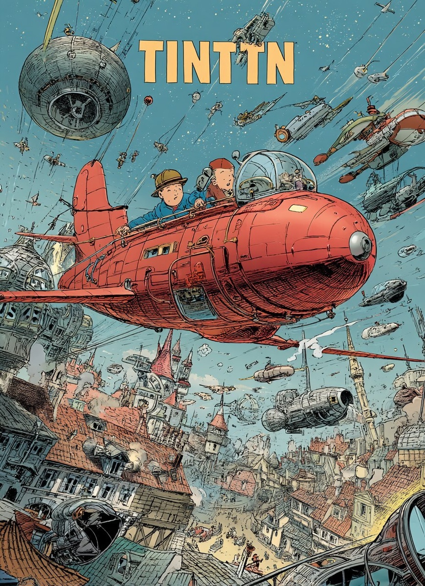 Создано на основе запроса: "TINTIN" and the Spaceships of Yesteryear, comic book cover, hyperdetailed, space adventure, haddock, cuthbert, thompson thomson, full color, chaos, herge, --- Автоперевод: «Тинтин» и космические корабли прошлых лет, обложка комиксов, гипердиаправочный, космический приключение, виктик, Катберт, Томпсон Томсон, полный цвет, хаос, Герж, Неплохо получилось? 🤔 https://dzen.ru/id/65c0c65c86e4f837c27b24d7 #ИИ #AI #нейросеть #midjourney #art