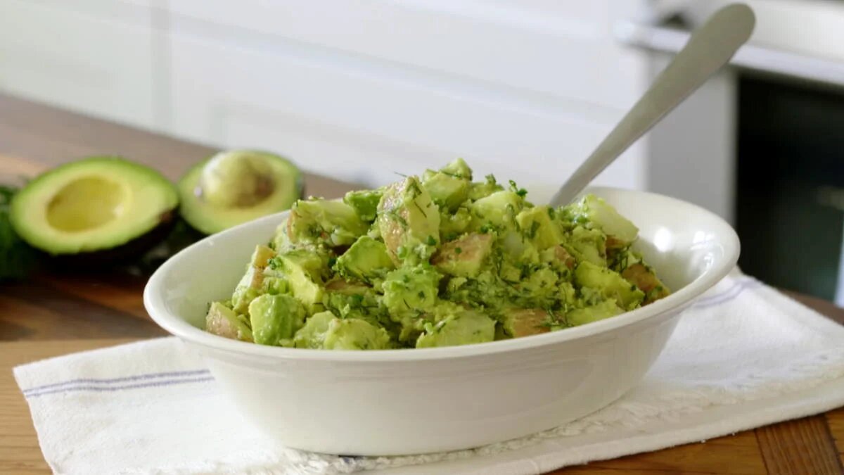 Салат с авокадо и картофелем – это блюдо настоящее лакомство, которое прекрасно подойдёт для перекуса или полноценного приёма пищи. На его приготовление уйдёт не больше получаса.