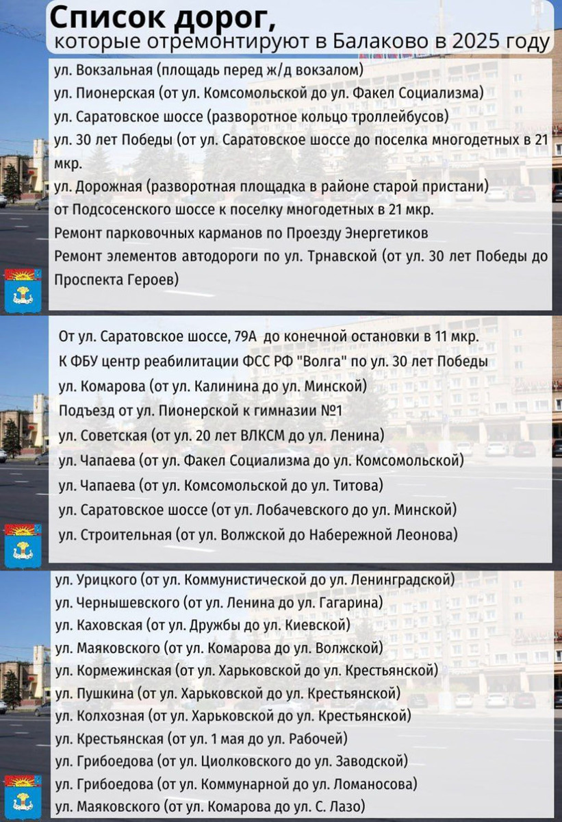 и другие. Контракт на ремонт 28 участков автомобильных дорог получило ООО «Автотрасса». Сумма контракта составляет более 271 миллиона рублей. Работы включают ремонт улиц Вокзальной, Пионерской, Саратовского шоссе, а также подъездов к