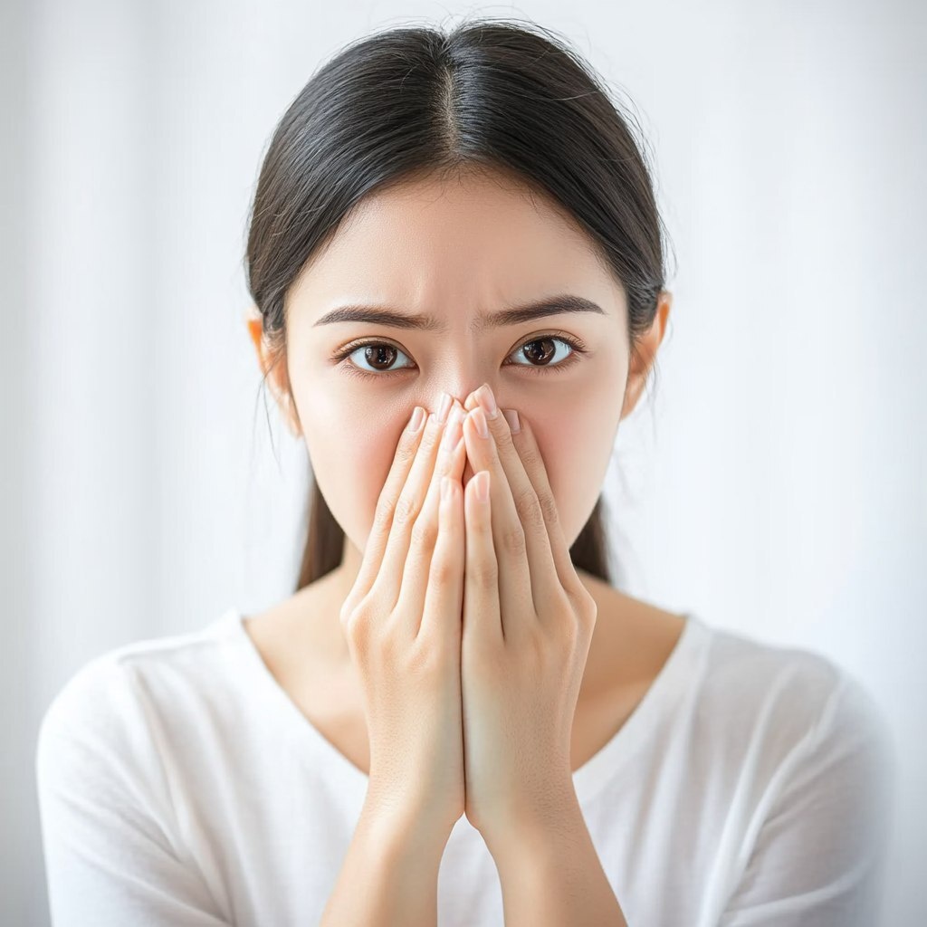 Создано на основе запроса: Asian woman covering her nose and mouth with her hands due to bad breath