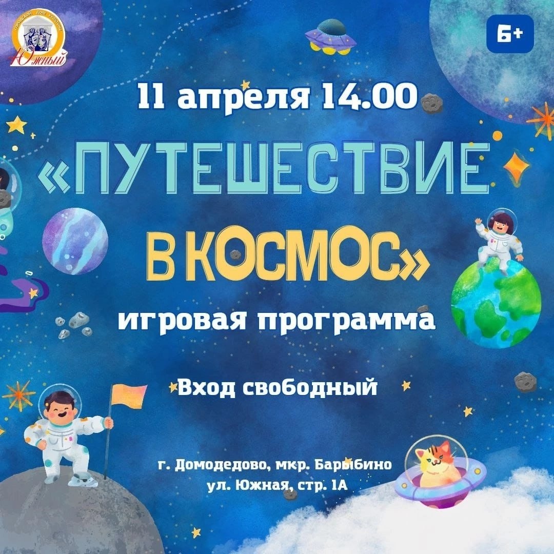 ✨ Дорогие друзья! Приглашаем вас на игровую программу «Путешествие в космос» 🌌👨🏻🚀 🚫 Возраст: 6+ 📆 11.04.2025🕒14:00 🏢 Городской дом культуры «Южный» 📍 г.о.Домодедово, мкрн.Барыбино, ул.Южная, стр1А 💰 Вход свободный❗️ ✅ Мероприятия Домодедово https://dzen.ru/id/66f10385cc4c5a16f7b5fb02 http://vk.com/domodedovo_events http://dzen.ru/domodedovo_events
