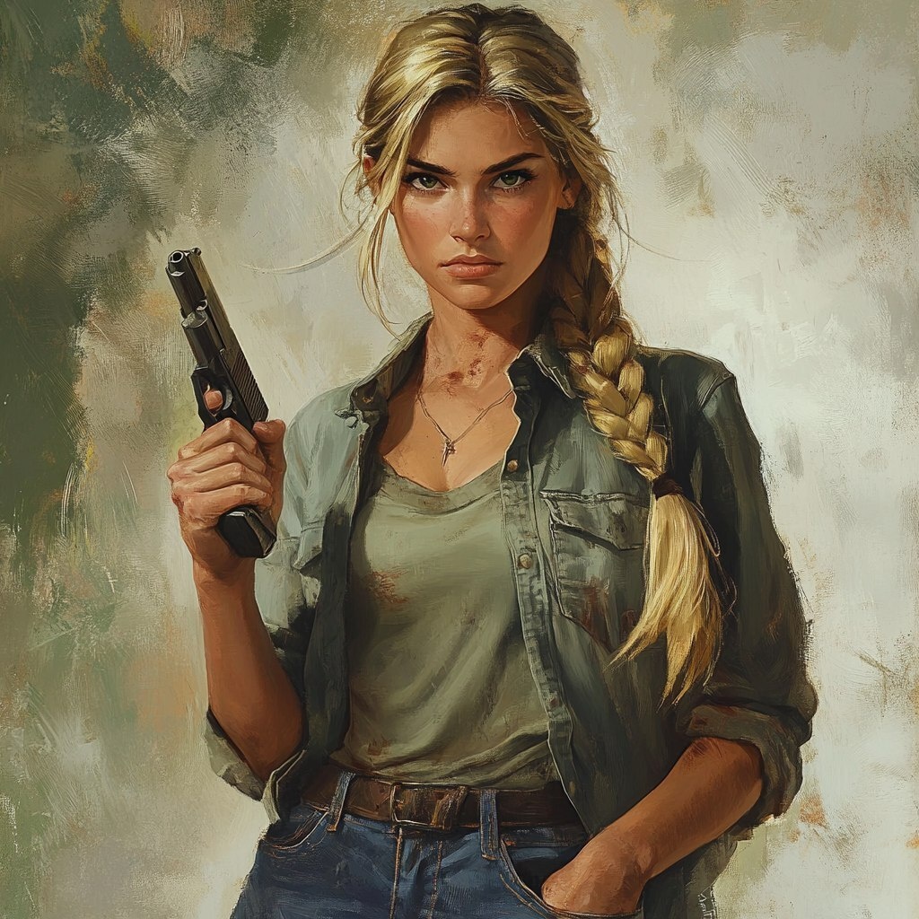 Создано на основе запроса: A young woman in her twenties, long blond hair tied in a braid (with a long white streak) Soft round face (not fat, not thin) Intense green eyes Serious face to be determined Dressed in a dirty t-shirt, shirt and worn jeans. She's holding a pistol Fighting stance --- Автоперевод: Молодая женщина в возрасте двадцатых годов, длинные светлые волосы, привязанные к оплетке (с длинной белой полосой) мягким круглым лицом (не толстым, не тонким) интенсивным зеленым глазами, серьезное лицо, которое будет решительно одет в грязную футболку, рубашку и изношенные джинсы. Как тебе генерация? 🤔 https://dzen.ru/id/65c0c65c86e4f837c27b24d7 #ИИ #AI #нейросеть #midjourney #art
