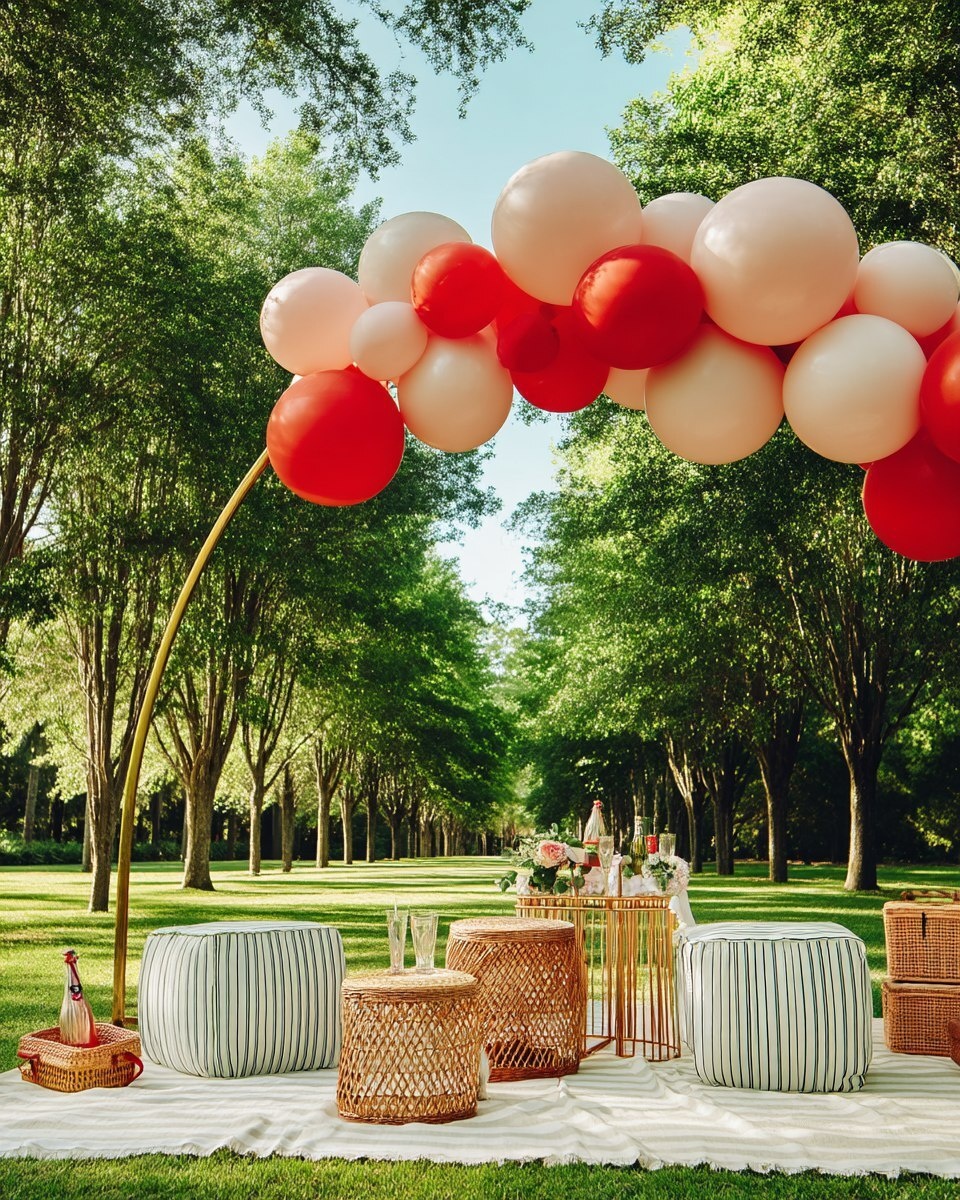 Создано на основе запроса: Boho spaceships bachelorette party set-up in a park: pretty drinkware, balloons arches, ottomas and day beds