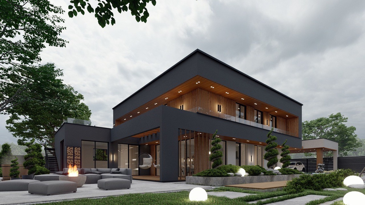 🦩Концептуальные решения на интерьер пространства бассейна, кухни-гостиной и спальни дома в 2 этажа с плоской кровлей и террасами