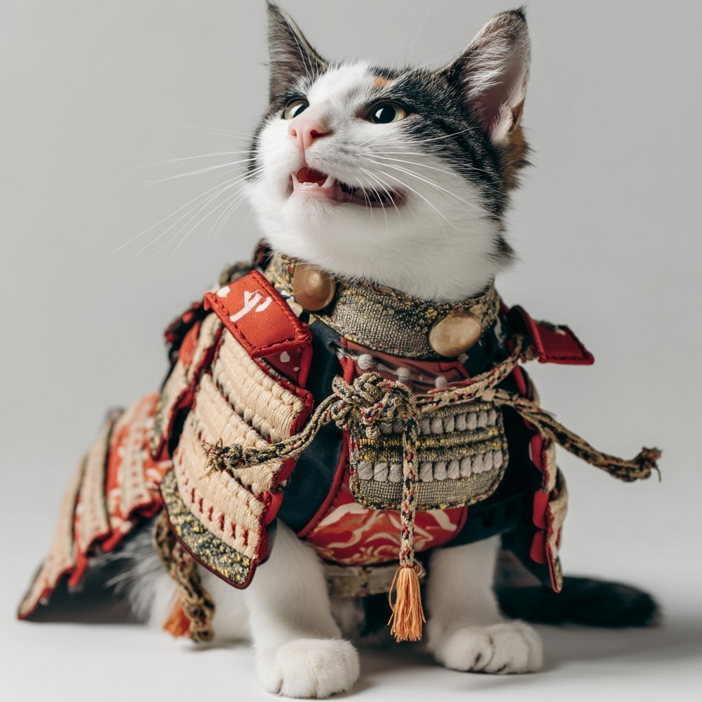 Создано на основе запроса: Bicolor cat dressed as a samurai, pure white background, looking happy