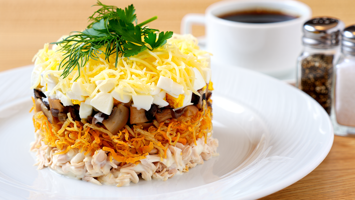 Этот салат — настоящая классика домашней кухни. Все ингредиенты отлично сочетаются между собой, создавая насыщенный вкус и приятную текстуру. Жареные грибы, морковь и лук придают салату аромат, картофель и яйца добавляют сытности, а сыр и майонез — нежность. Зелень освежает вкус и делает блюдо визуально аппетитным. Ингредиенты: 🍗 куриная грудка - 300 гр. 🧅 лук - 1 шт. 🥕 морковь - 1 шт. 🥔 картофель - 2 шт. 🥚 яйца - 2 шт. 🍄 грибы - 200 гр. 🧀 сыр - 70 гр. 🧂🌶️ соль и перец - по вкусу 🥬 зелень для украшения 🥪 майонез Приготовление: Куриную грудку отварить и мелко порезать. Картофель отварить и нарезать кубиками. Яйца сварить и нарезать на кубиками. Лук мелко нарезать и обжарить на растительном масле до золотистости. Шампиньоны нарезать ломтиками, обжарить на сковороде до румяности. Морковь натереть на крупной тёрке, обжарить на сковороде до мягкости. Сыр натереть на мелкой тёрке. Зелень укроп или петрушку мелко порезать. Можно каждый слой натереть