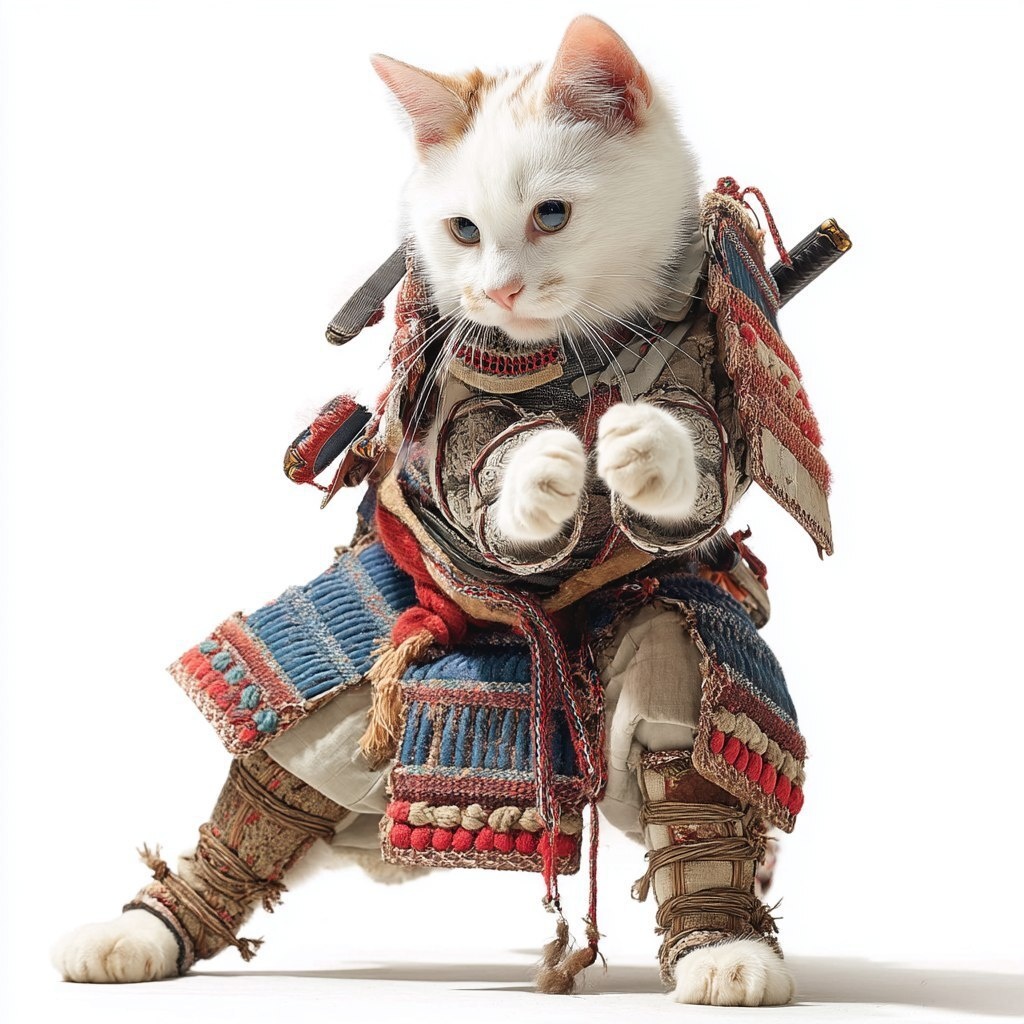 Создано на основе запроса: Samurai cat, pure white background, standing with legs apart