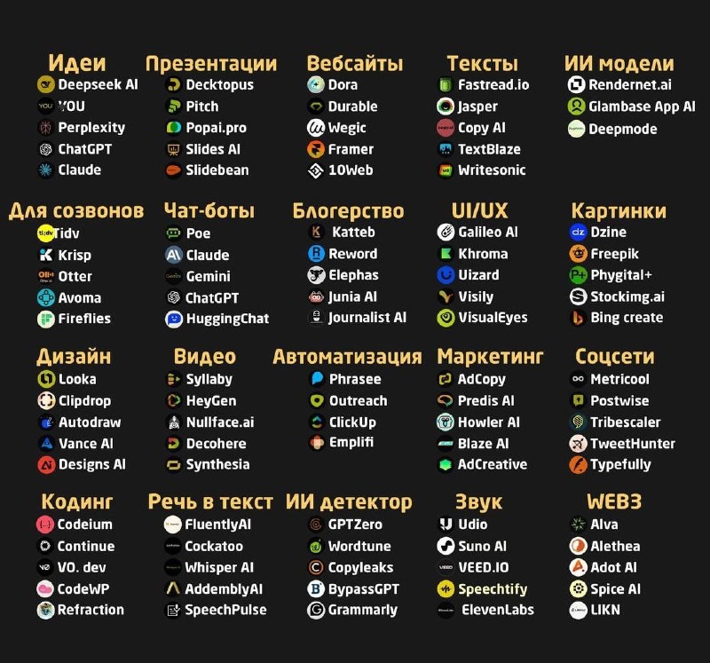Это нейронки на ВСЕ случаи жизни — в сети нашли мегашпаргалку с сервисами для самых разных задач. Сохраняем. Подробнее: https://hard-tm.su/threads/85356/ 🕹HARD-TM — Подписаться