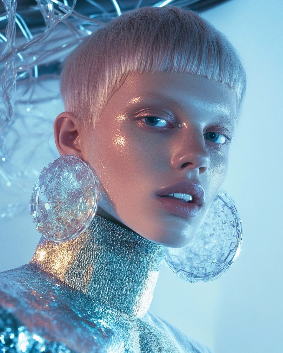 Создано на основе запроса: A close-up portrait of a person with short, light-colored hair, wearing large, metallic statement earrings and a