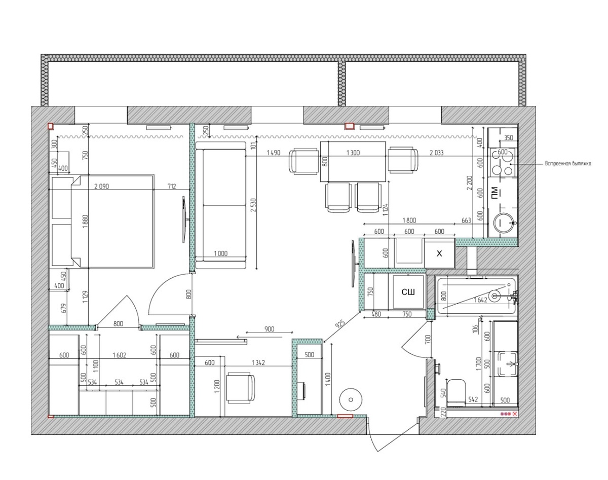 Как итог, мы получили входную зону со шкафом для верхней одежды, пуфик и крючки, технический шкаф для стиральной и сушильной машины, места для хранения гладильной доски. За счёт этого вышла просторная ванная комната с большим количеством мест хранения. Зона гостиной с диваном, стол на четверых, который можно разобрать, кухонный гарнитур с пеналами во всю стену, ну и главное, кабинет! И нашлось место для спальни с просторной кроватью 180 см, гардеробной.