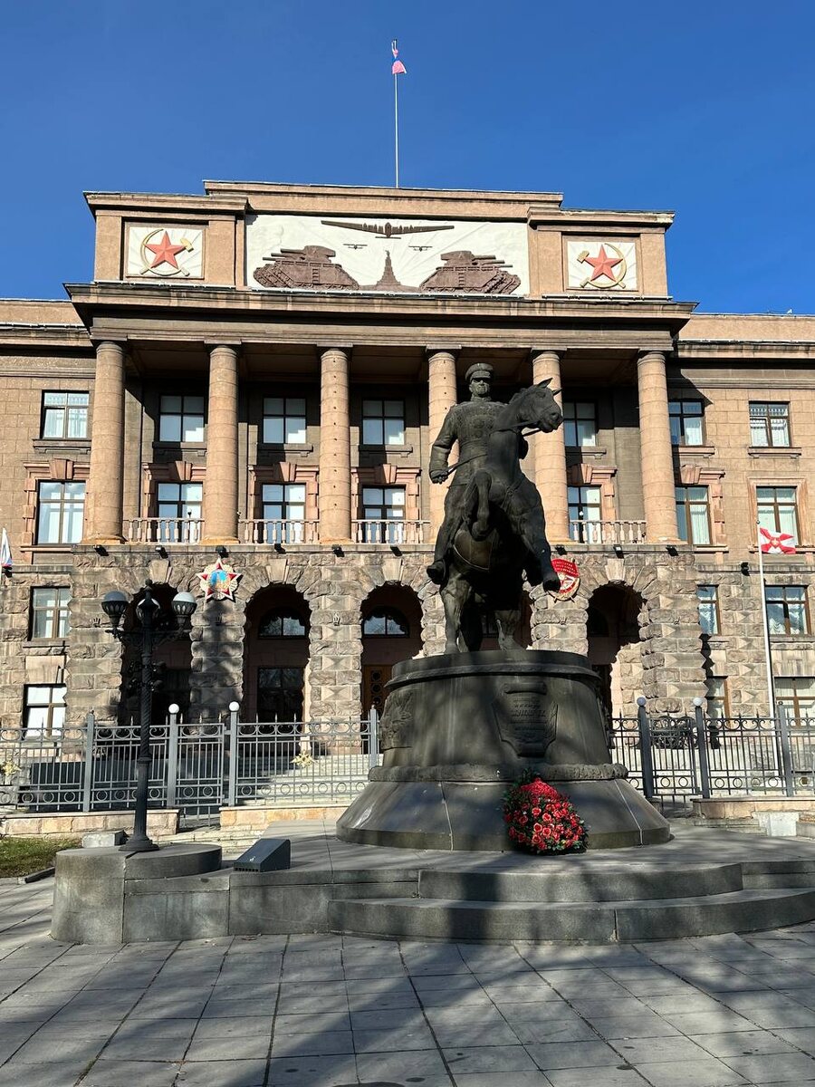 Екатеринбург. Здание уральского военного округа. Комплекс штаба военного округа выстроен в 1937-1940 году накануне великой отечественной войны. Само здание штаба было окончено зимой 1937 года. 15 января 1938 главного архитектора Алексея Дукельского расстреляли как участника троцкистской антиреволюционной организации. В самом здании нас привлекли две детали: Первая - барельеф, на котором АНТ-20 "Максим Горький" летит в сопровождении истребителей над никогда не осуществлённым дворцом советов, окружённым гигантскими танками. Вторая - каменные ограждения с красной звездой. 📱 Архитекстура #Екатеринбург