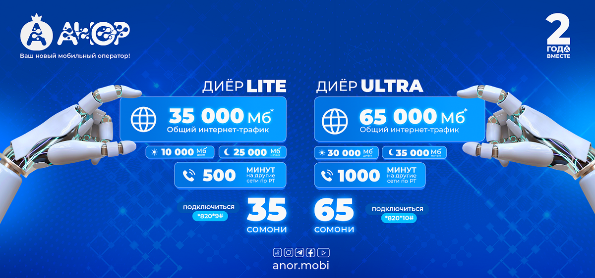 Компания «Анор», один из самых молодых и динамично развивающихся операторов связи в Таджикистане, запустила тарифные планы, в которых еще больше минут, интернета и свободы общения по доступной цене. За два года своей истории «Анор» завоевал доверие пользователей, предлагая качественную связь и выгодные условия. Новый тарифный ряд – это ответ на запросы клиентов, которые хотят больше возможностей без лишних затрат. Тариф «Диёр Ultra» за 65 сомони в месяц предлагает пользователям 65 000 Мб мобильного интернета, из которых 30 000 Мб доступны днём, а 35 000 Мб – ночью. Абоненты также получают безлимитные звонки внутри сети, 1 000 минут на звонки другим мобильным операторам Таджикистана и 50 SMS по всей стране. Тем, кто ищет более доступный вариант, подойдет тариф «Диёр Lite» за 35 сомони в месяц. Это 35 000 Мб интернета, включая 10 000 Мб для использования днем и 25 000 Мб ночью. Кроме того, в пакет входят безлимитные звонки внутри сети, 500 минут для связи с абонентами других мобильных оп