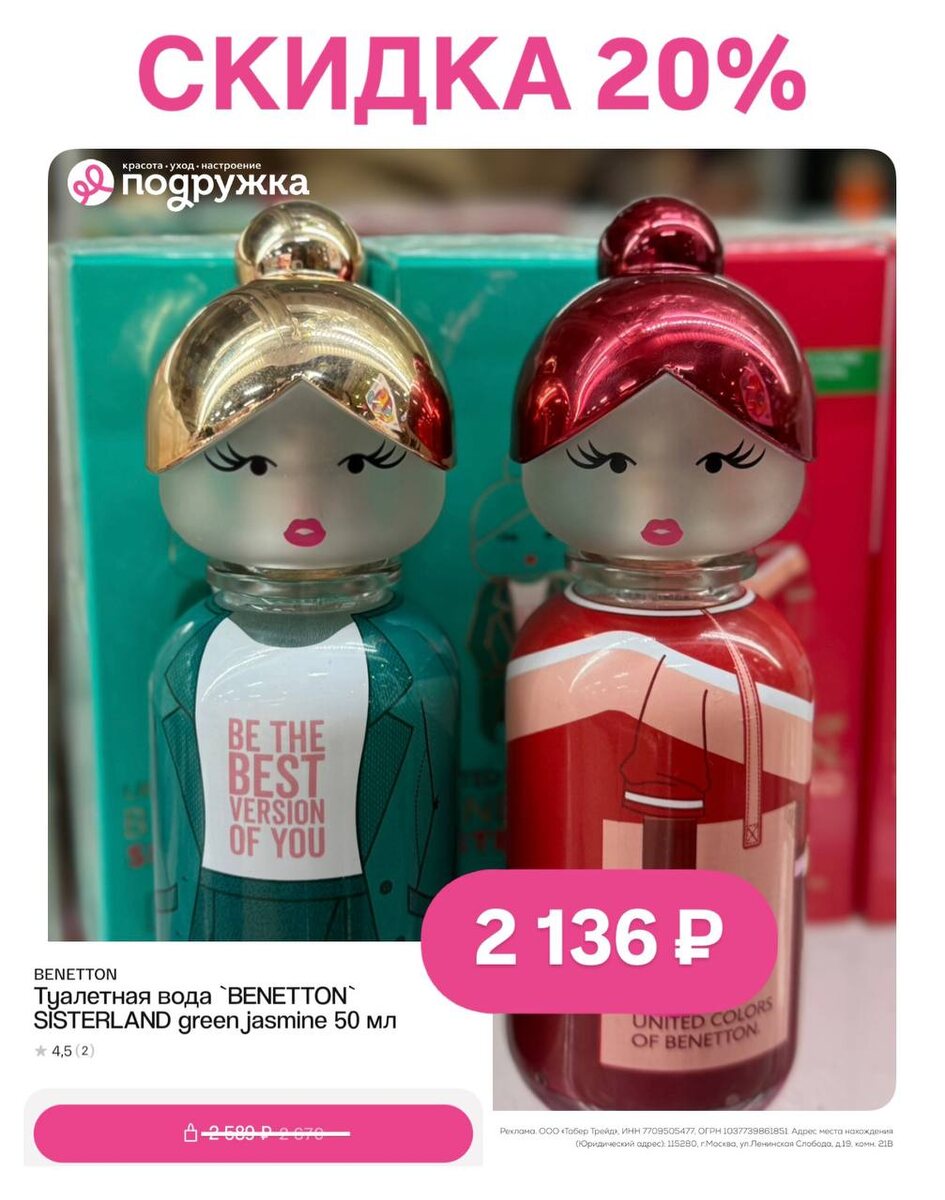 В Подружке скидка на Туалетную воду BENETTON за 2136 ₽ вместо 2670 ₽ Скидка 20% для всех: ▪️ ____ для заказа онлайн ▪️ ____ для покупки на кассе Необходимо показать карту клиента ➕ Суммируется только со скидкой 5% на покупки с 9:00 до 12:00 ____