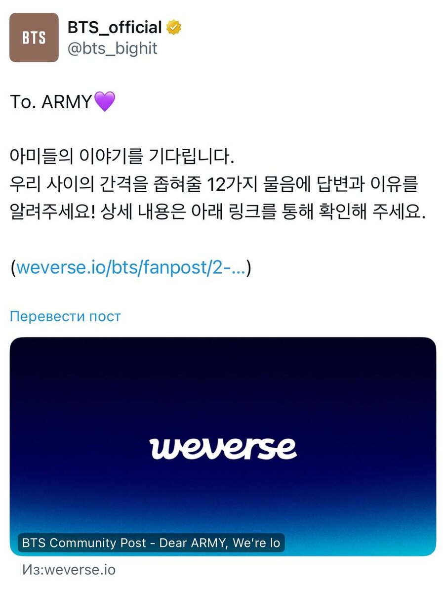 🍊 BTS Official в X: Для Арми 💜 Ждём ваши истории. Ответьте на 12 вопросов, которые помогут нам сблизиться, и объясните свой выбор! Подробности по ссылке. #BTS 🐈🌱[https://dzen.ru/id/5f3ce54ccaeef80d2efd6e05]🌱🐈