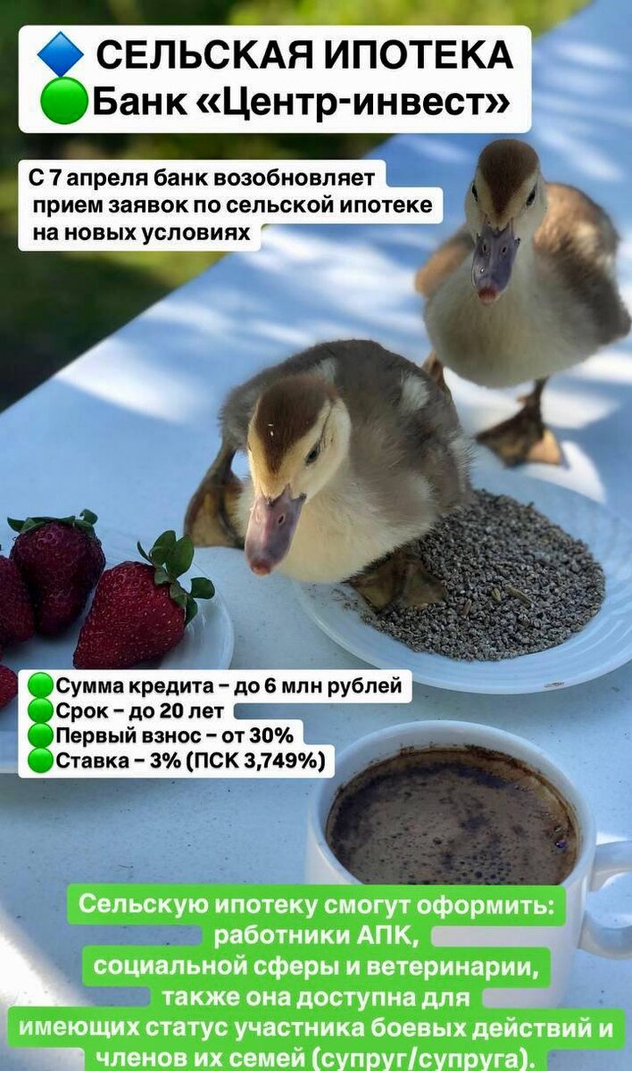 🔷 Банк «Центр-инвест» возобновляет сельскую ипотеку С 7 апреля банк возобновляет прием заявок по сельской ипотеке на новых условиях! Сельскую ипотеку смогут оформить работники АПК, социальной сферы и ветеринарии, также она доступна для имеющих статус участника боевых действий и членов их семей (супруг/супруга). 🟢Сумма кредита – до 6 млн рублей 🟢Срок – до 20 лет 🟢Первый взнос – от 30% 🟢Ставка – 3% (ПСК 3,749%) ❗️К сожалению, сельская ипотека всем становится не доступна! 🖊Если остались вопросы, пишите в комментарии Либо позвоните ☎️ +7 (960) 498-47-95