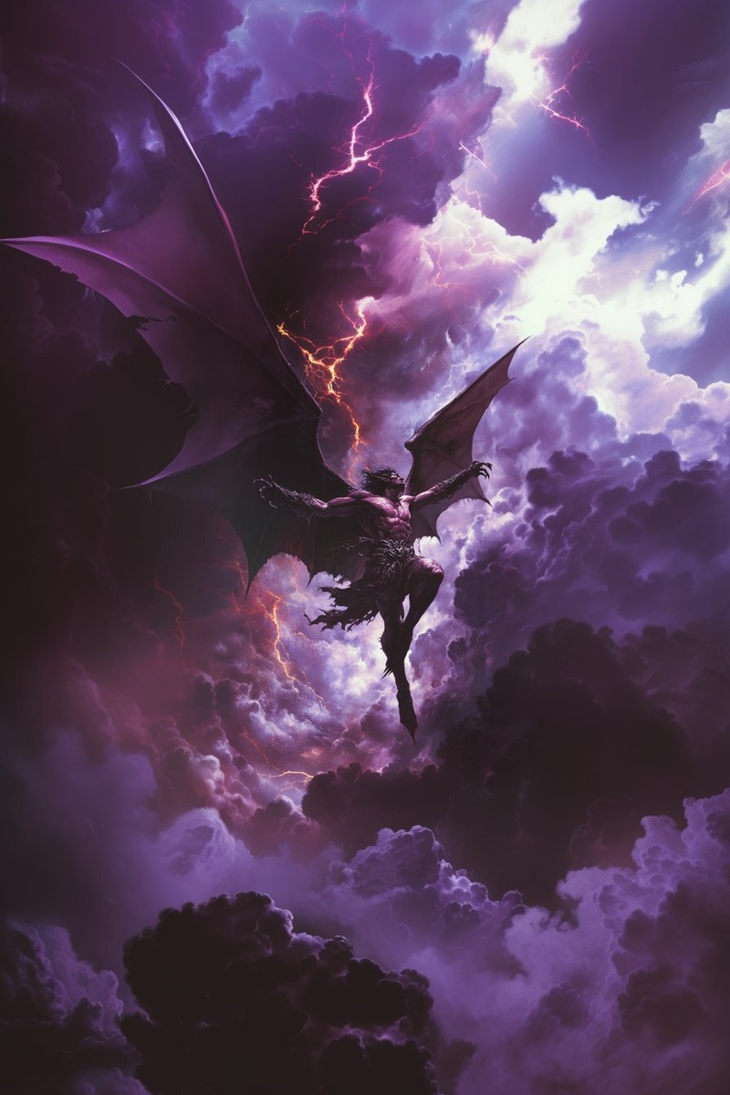 Создано на основе запроса: dnd style painting of the fall of lucifer with bat wings dramatically falling downwards through the skies with theatrical grace as he was cast out of heaven, his arms are outstretched hoping to be saved, one leg is bent backwards at the knee. he is falling downwards. his fingers are elongated claws. 1980's tshirt art refering iron maiden. his wings attached to his arms to his wrists. red lightning crashing around him as he falls through purple clouds. extremely dynamic Pose with motions, tshirt design, character, --- Автоперевод: Картина в стиле DND Падения Люцифера с крыльями летучих мышей, резко падающих вниз по небу с театральной благодати, когда его изгнали с небес, его руки вытянуты в надежде спасти, одна нога согнулась назад на колене. Интересно получилось? 🤔 https://dzen.ru/id/65c0c65c86e4f837c27b24d7 #ИИ #AI #нейросеть #midjourney #art