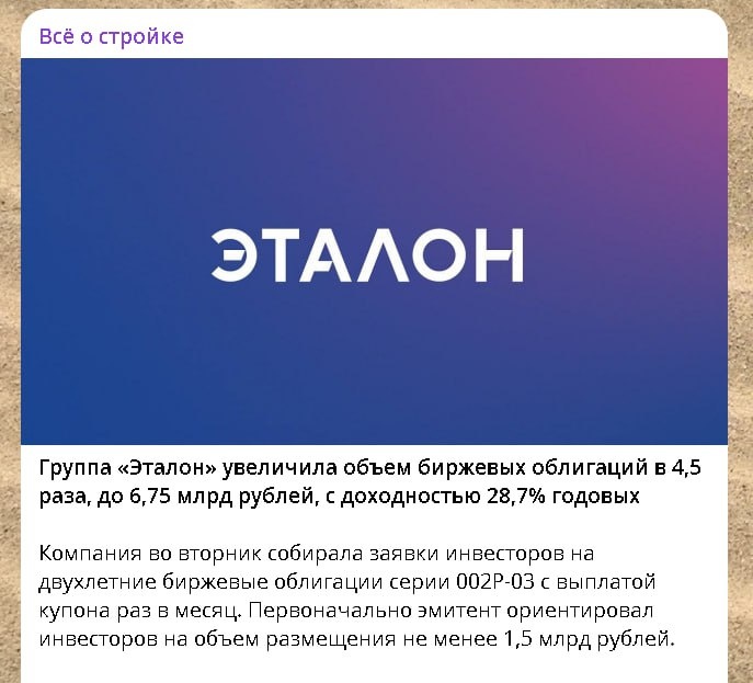 В ходе вчерашнего размещения облигаций, застройщик Эталон увеличил сумму заимствования в 4,5 раза. С 1,5 до 6,75 млрд. руб. Доходность 28,7% годовых. Та самая контора, которая две недели назад показала чистый убыток за прошлый год почти на 7 млрд. А они смогут обслуживать эти облигации с такими выходными данными? Или это уже не важно. И о чём думал инвесторы их покупавшие? Адреналин так и прёт. Почти 30% годовых, - страхи в топку! 🤘🤘🤘 Очень рисковый народ на фонде! 📱Витрина готовых справок по надёжности ЖК Зде info; здесь 📱Форум Ззз здесь