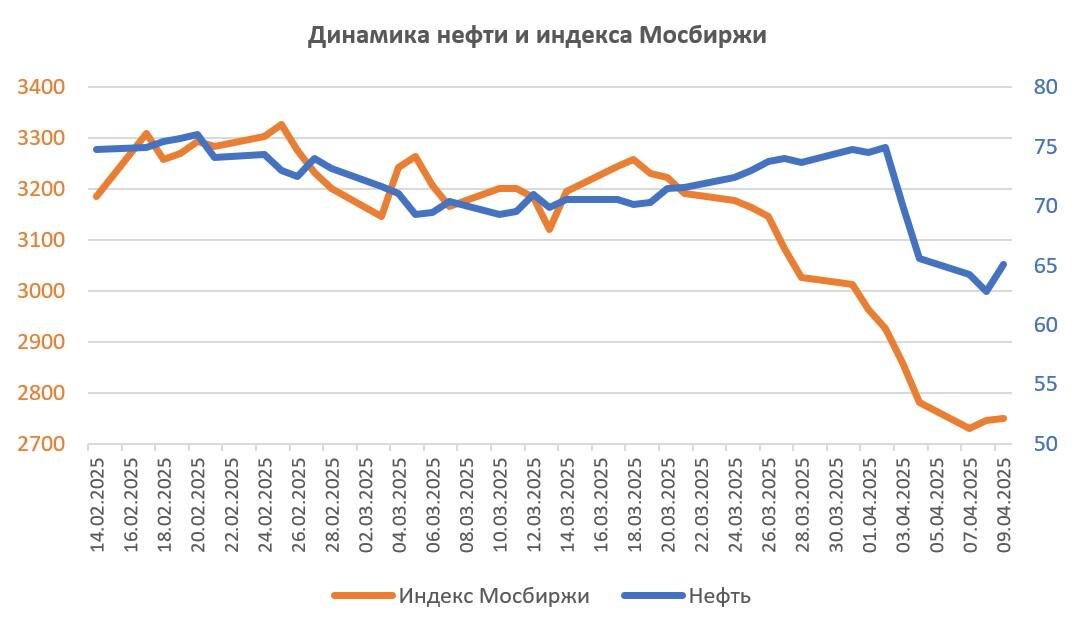 Дональд Трамп вводит 90-дневную паузу на пошлины в отношении более 75 стран и продолжает давить на Китай — для него тарифы повышены до 125%. Нефтяные быки взбодрились и стали быстро закрывать шорты, чем спровоцировали сильный рост котировок черного золота. Комбинация технических индикаторов Bollinger Bands и RSI сигнализировала о коррекции в нефти, и рынок дождался прекрасного повода. Индекс Мосбиржи в среду на вечерней сессии пошел вверх вслед за нефтью, и все ликвидные бумаги показали достаточно сильный рост котировок. Деловые СМИ называют Вашингтон победителем в тарифной войне, однако у Пекина есть козырь в рукаве — китайцы входят в тройку крупнейших держателей американского госдолга с объемом инвестиций $760 млрд. Если они начнут продавать часть бумаг на рынке, то мы увидим резкий рост доходности, что породит нестабильность в американской финансовой системе. К сожалению для нас, нефтяной рынок это также затронет, что усилит давление на индекс Мосбиржи в будущем. Далее по отдельным