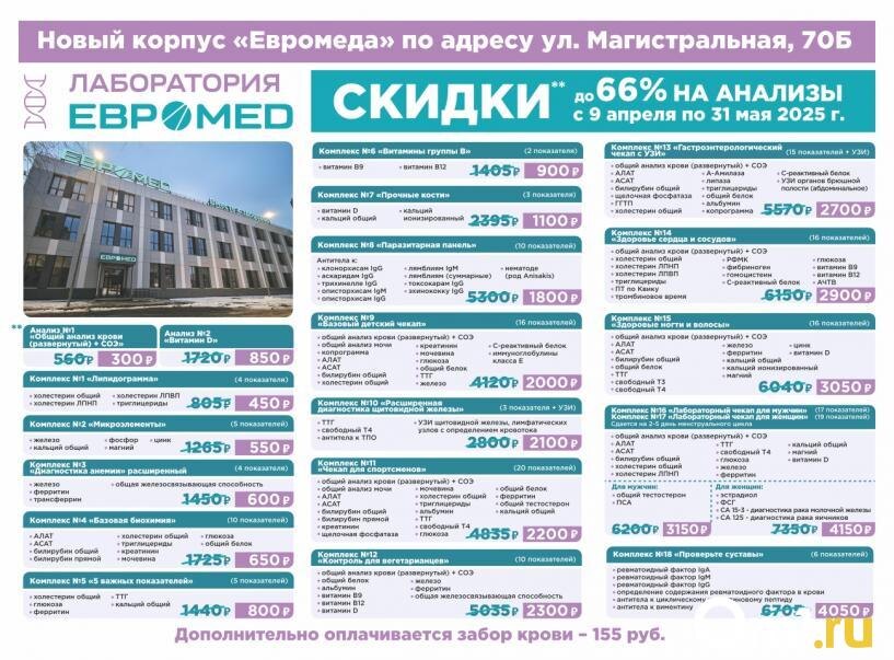 Приятная новость для жителей Нефтяников: в начале апреля распахнул двери новый современный корпус «Евромеда» на улице Магистральной, 70Б. В трёхэтажной клинике площадью около двух тысяч квадратных метров можно получить широкий спектр услуг: Кстати, лабораторные исследования на Магистральной сейчас можно пройти по выгодным ценам. С 9 апреля по 31 мая 2025 года действуют скидки ** до 66% на ряд анализов и комплексных исследований. «Евромед» стремится оказывать медицинскую помощь, отвечающую самым высоким стандартам, и делать всё, чтобы пациентам было комфортно. В здании новой поликлиники организованы аптечный пункт и кофейня, чтобы сразу после приёма можно было купить необходимые лекарства и порадовать себя десертом и кофе. В честь открытия «Евромед» приготовил для пациентов множество приятных сюрпризов. Так, например, все пациенты, получившие услуги в поликлинике на Магистральной с 9 апреля по 31 мая 2025 года, смогут принять участие в розыгрыше** 70 подарков и главного приза — сертифик
