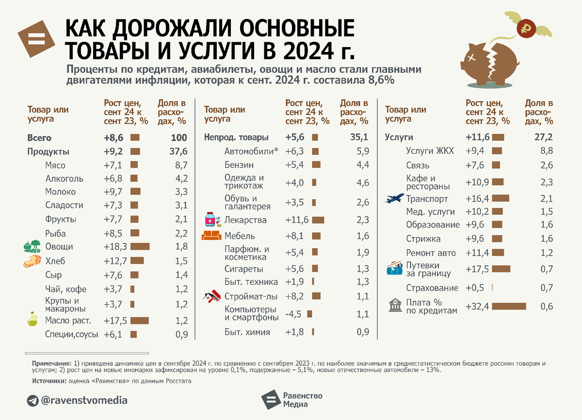 Есть на просторах интернета интересный Телеграм-канал, который публикует материалы разных авторов по разной тематике, общество, политика, экономика и так далее. Канал имеет свою страницу на Дзене. В роли экономического эксперта в материалах канала «Равенство. Медиа» упоминается, например, учёный-экономист Олег Комолов, кандидат экономических наук, сотрудник одного из академического института. Осенью прошлого года меня заинтересовала одна таблица про рост цен в России в 2024 году, сравнение цен периодом один год от сентября 2023 до сентября 2024 года. Источник фото: dzen.ru Как видно из таблицы вся ценовая шкала делится на три группы. Примерно одну треть потребностей человека закрывают продукты, примерно одну треть непродовольственные товары и примерно одну треть услуги. В общей массе всех потребностей человека больше всего его интересуют те, которые помогают ему выживать. Для россиян, я думаю, более 60% населения мало интересна поездка за границу или стоимость осетрины в ресторане. А в