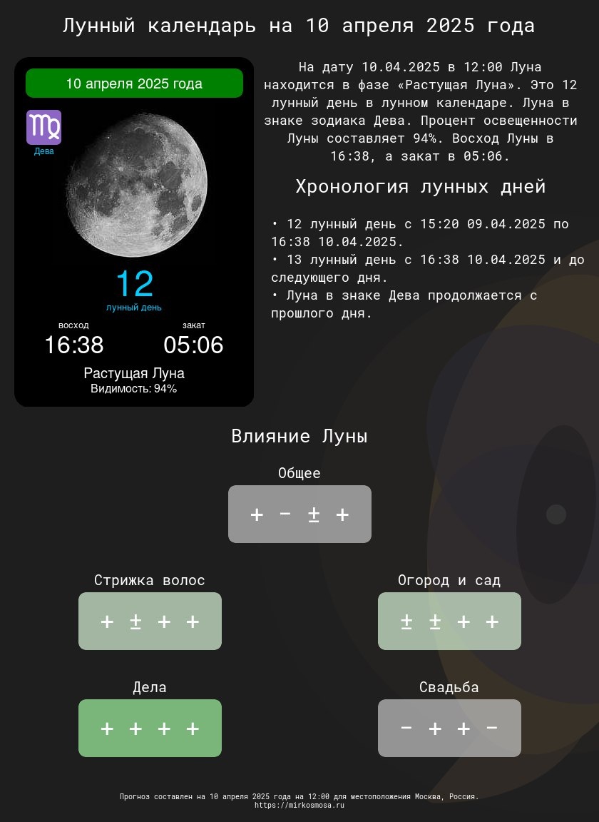 Лунные календари на 10 апреля 2025 года: Подготовьтесь к этому дню с учетом влияния Луны! 🔹🌗 Лунный календарь на 10 апреля 2025 года — Что приготовила Луна? Подробнее 🔹✂️ Лунный календарь стрижек на 10 апреля 2025 года — Подходящий ли день для обновления прически? Подробнее 🔹🌱 Лунный календарь огородника и садовода на 10 апреля 2025 года — Лучшее время для ухода за растениями. Подробнее 🔹📅 Лунный календарь дел на 10 апреля 2025 года — Удачные моменты для важных задач. Подробнее 🔹💍 Лунный календарь свадеб на 10 апреля 2025 года — Подходит ли этот день для вашего торжества? Подробнее