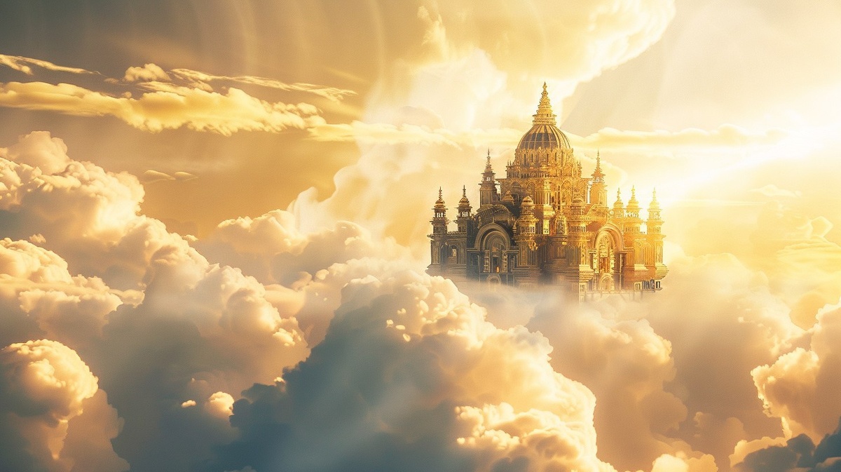 Создано на основе запроса: Golden palace floating in the clouds, surrounded by glowing cumulus clouds, heavenly sunlight breaking through