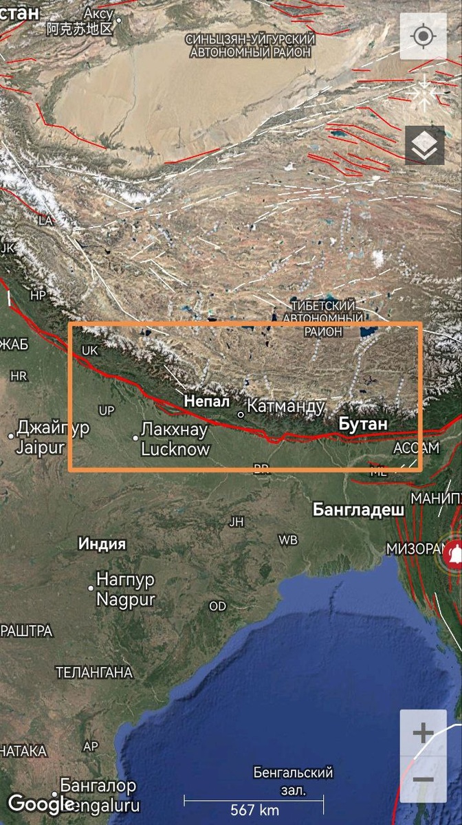 Началась сильная дегазация вдоль Гималаев. Особенно нужно отметить зону в Непале (фото 4-7), где по типу провала считываются контуры местной рифтовой зоны. В теории есть вероятность землетрясения М6+ в течение 9 дней. === Powerfull degassing has begun along the Himalayas. It is especially necessary to note the zone in Nepal (photos 4-7), where the contours of the local rift zone are read by the type of sinkhole. In theory, there is a probability of an M6+ earthquake within 9 days.